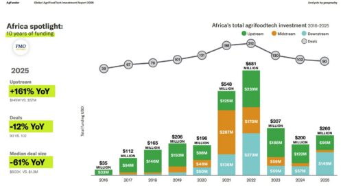 Also on the up is investment into African companies, with an increase of 30% to $260M across 90 deals. The biggest categories are Agmarket places and fintech, as well as home cooking.