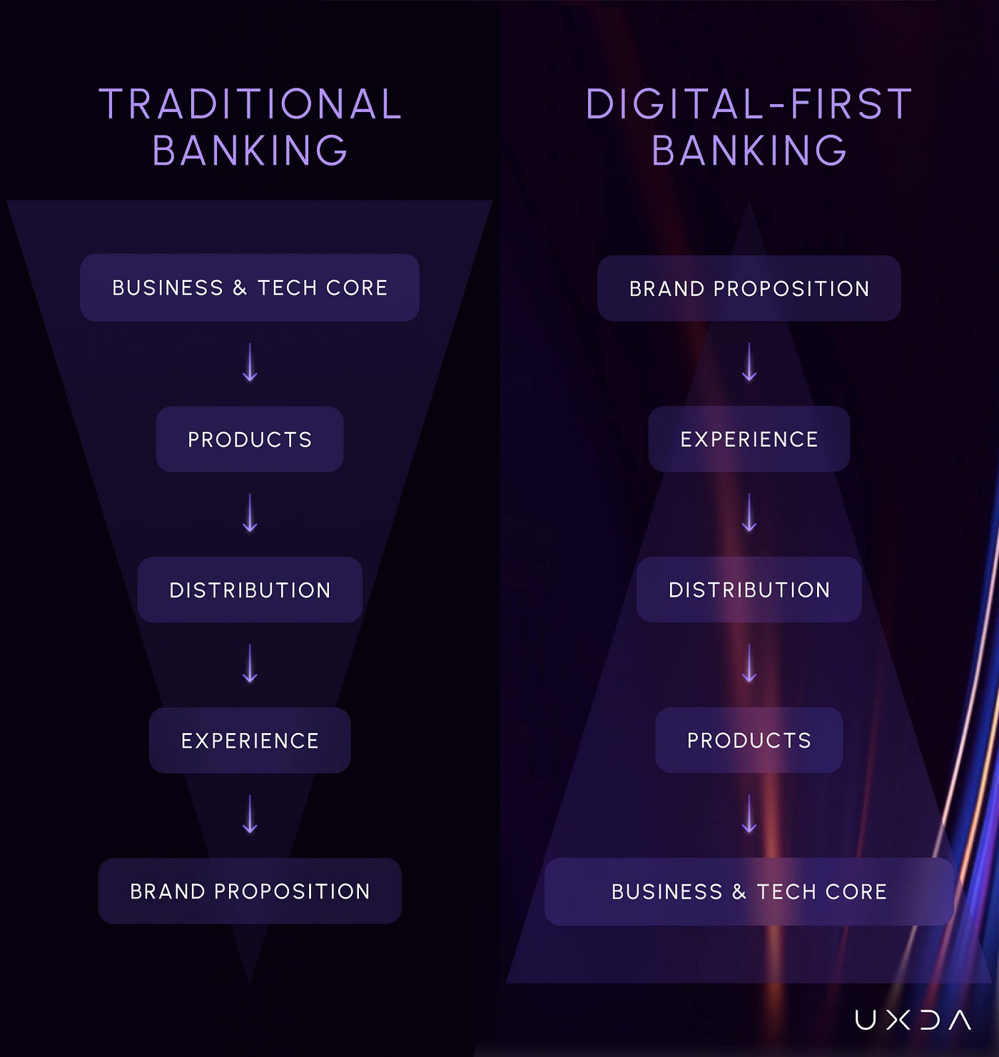 Fintechs and digital-first banks flipped the traditional model by building from the outside in — starting with purpose and customer promise, then shaping experience, distribution, products, and finally the core. Their logic: understand