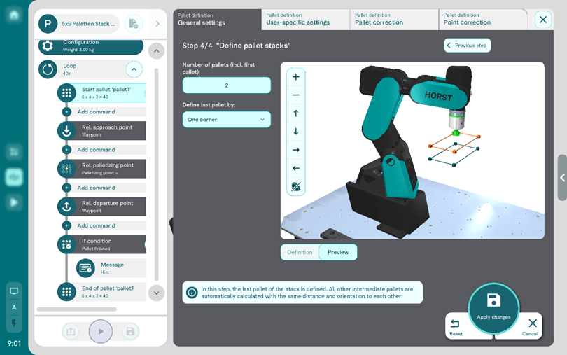Eine schnellere Umsetzung von End-of-Line-Packaging und anderen Palettieraufgaben wird durch die weiterentwickelte Palettier-Wizard-Funktion ermöglicht. Mehrlagige Paletten können nun vollständig grafisch und ohne textuelle Programmierung erstellt werden, was die Komplexität in der Einrichtung deutlich reduziert.